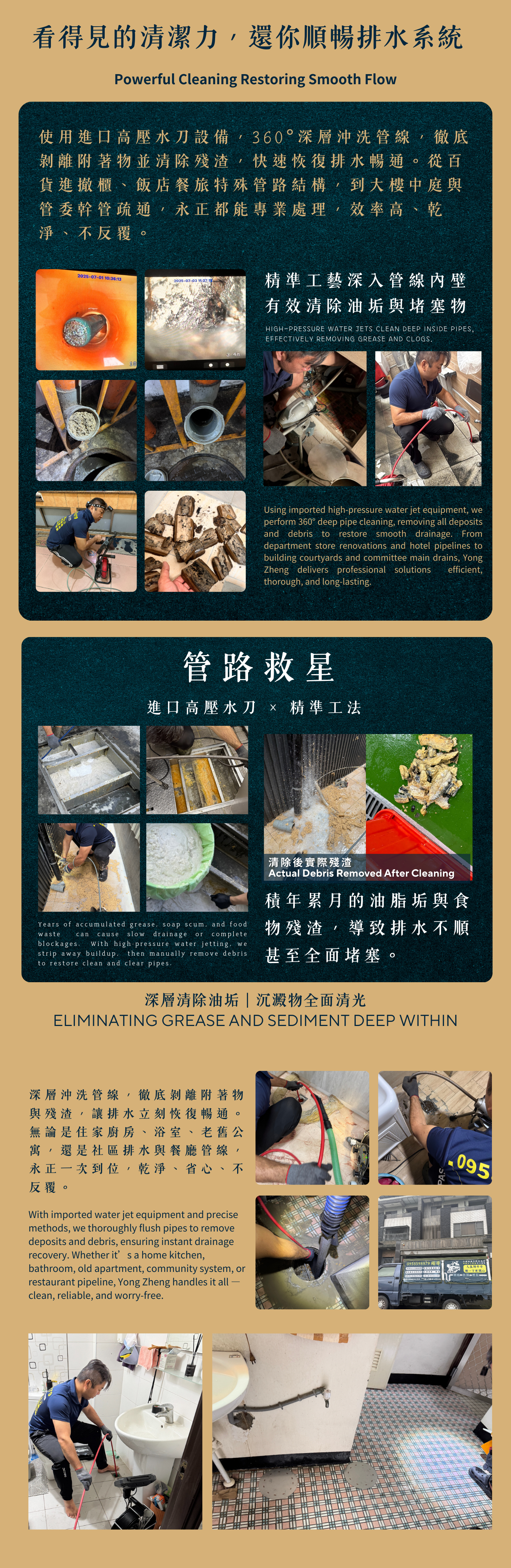 不只戶外容器,家中排水與大樓管線若阻塞也會增加登革熱風險。永正企業工程提供高壓水刀清洗、內視鏡檢查、截油槽維護與社區年約,雨季前後一次做好預防。